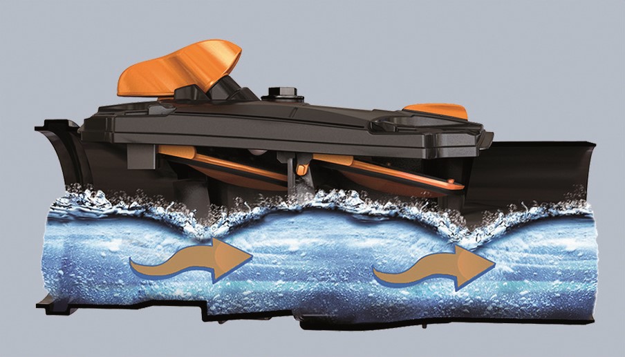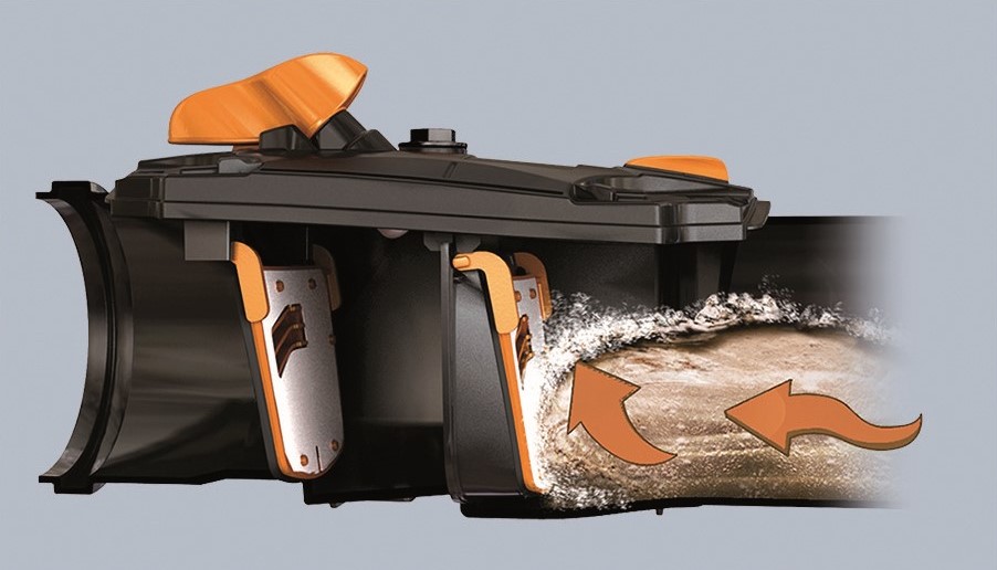 En una situación normal, el agua de saneamiento fluye a través de la válvula antirretorno, empujando en sentido del flujo las clapetas internas, en dirección a la salida de la válvula.