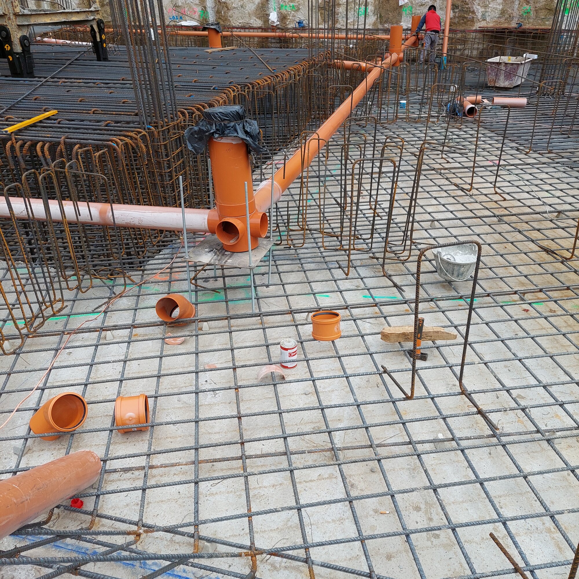 Una de las ventajas destacadas del Sistema Colector de Jimten Aliaxis es su capacidad para adaptarse a lugares donde la instalación es más complicada. En el caso de este proyecto, la solución está integrada dentro de la losa de hormigón. Para garantizar su correcta instalación, PRYCONSA está construyendo una base metálica que soportará el Sistema Colector a la cota necesaria, anclando las tuberías y arquetas para asegurar que no haya variaciones en la pendiente y cota de instalación al hormigonar.