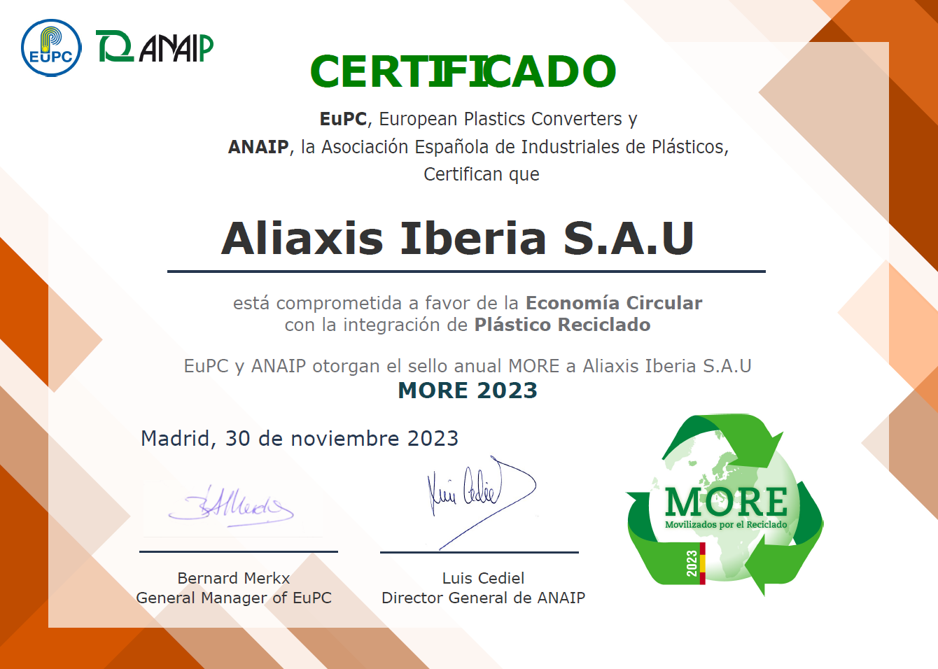 Como parte del Plan de Acción para la Sostenibilidad Ambiental, hemos recibido el Sello MORE por nuestro compromiso con la economía circular y el reciclaje de materiales, distintivo otorgado por la asociación ANAIP.