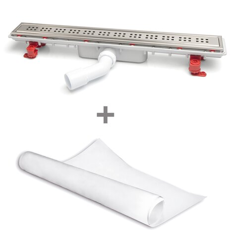 Canaleta Linnum con rejilla para plato de ducha de obra. Altura reducida. Sifón 30 mm. Ancho 50 mm. Salida orientable. Rejilla Classic. CERCO VISIBLE y lámina impermeabilizante